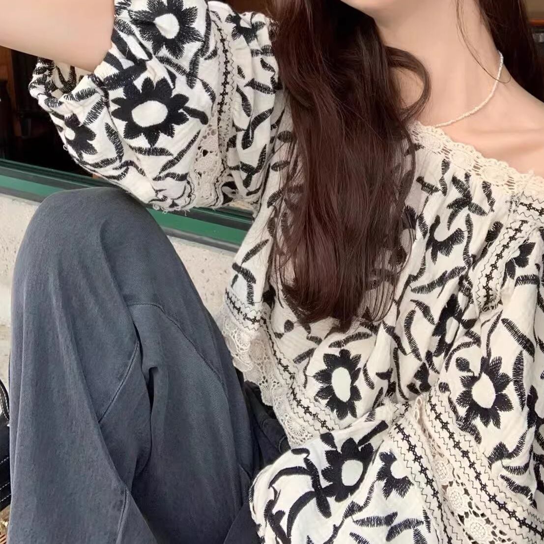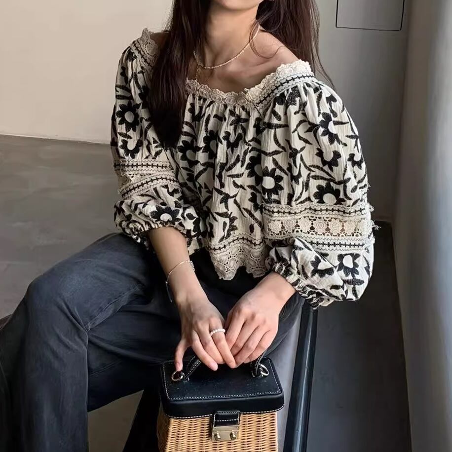 個性的で可愛いsquare neck off-shoulder lace patchwork top。