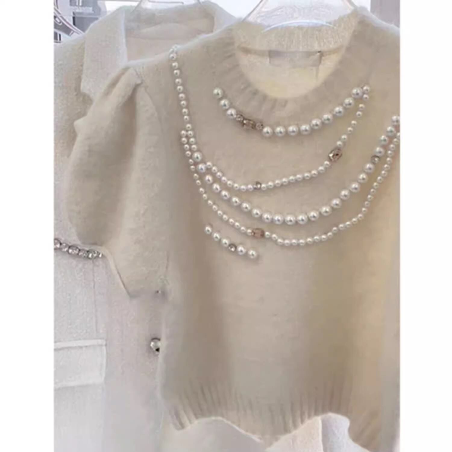 さりげない華やかさを演出するpearl chain decorated crew neck sweater。