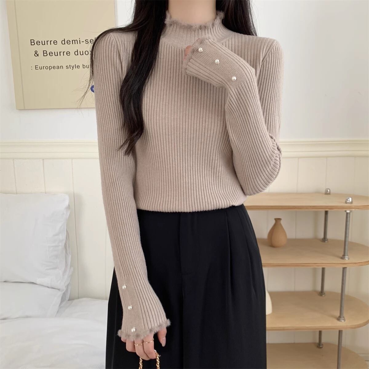 大人の女性にぴったりな、turtle neck top with pearl embellishments。